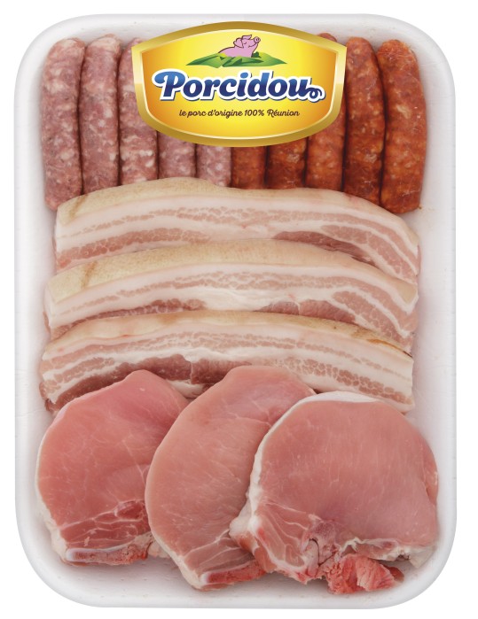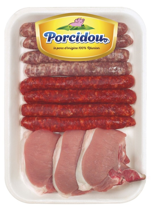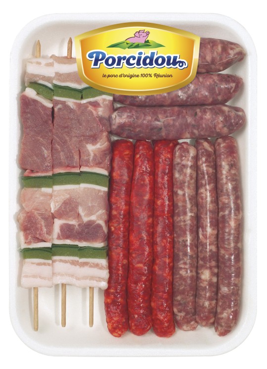 Chipolatas, merguez, saucisses créoles : viande de porc (90%), eau, sel, épices, dextrose, ail, arômes naturels, hémoglobine de porc, arôme : acérola, plantes aromatiques, extrait d’épices, boyau de porc et de mouton.
