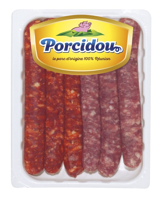 Ingrédients : viande de porc : (90%), eau, sel, dextrose, arômes, plante aromatique, ail, hémoglobine de porc, arôme : acérola, épices, boyau de mouton.