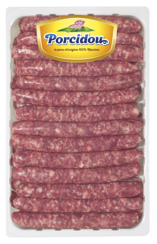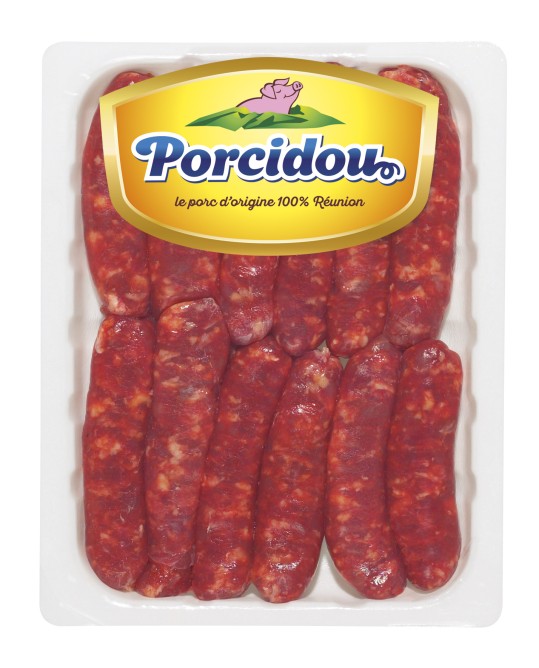Viande de porc (90%), sel, dextrose, épices (paprika, cumin, anis étoilé, fenouil, arômes, ail, extrait d’épices, arôme : acérola, plante aromatique, boyau de mouton.